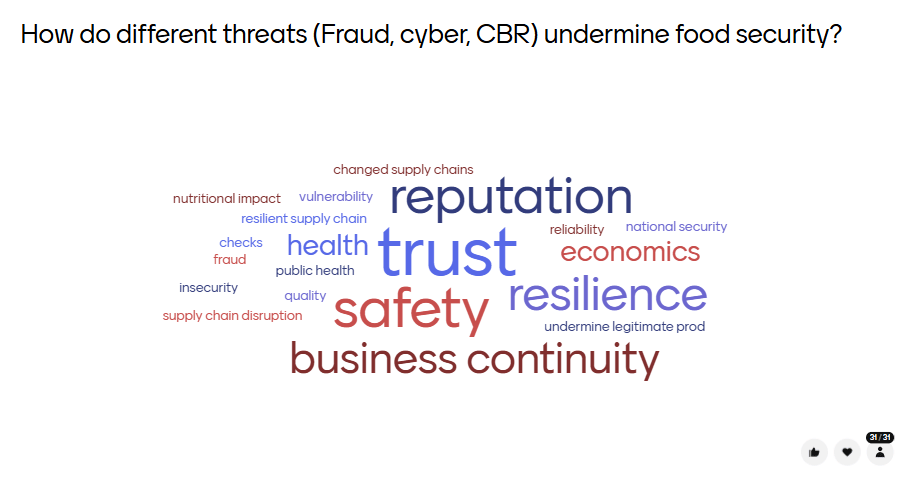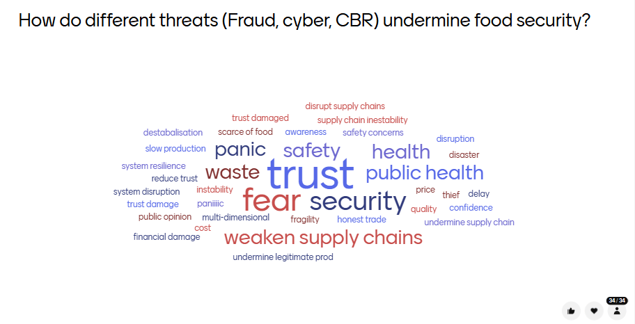 The post-discussion poll (Figure 3) shows that participants associated fraud, cyber, and CBR threats with a wide range of impacts on food security. The most prominent responses were trust, safety, resilience, reputation, and business continuity, alongside terms such as health, public health, economics, and vulnerability. This suggests that, after the discussion, participants viewed these threats not only as risks to safety and supply chains, but also as issues affecting system resilience, economic stability, and public confidence.
