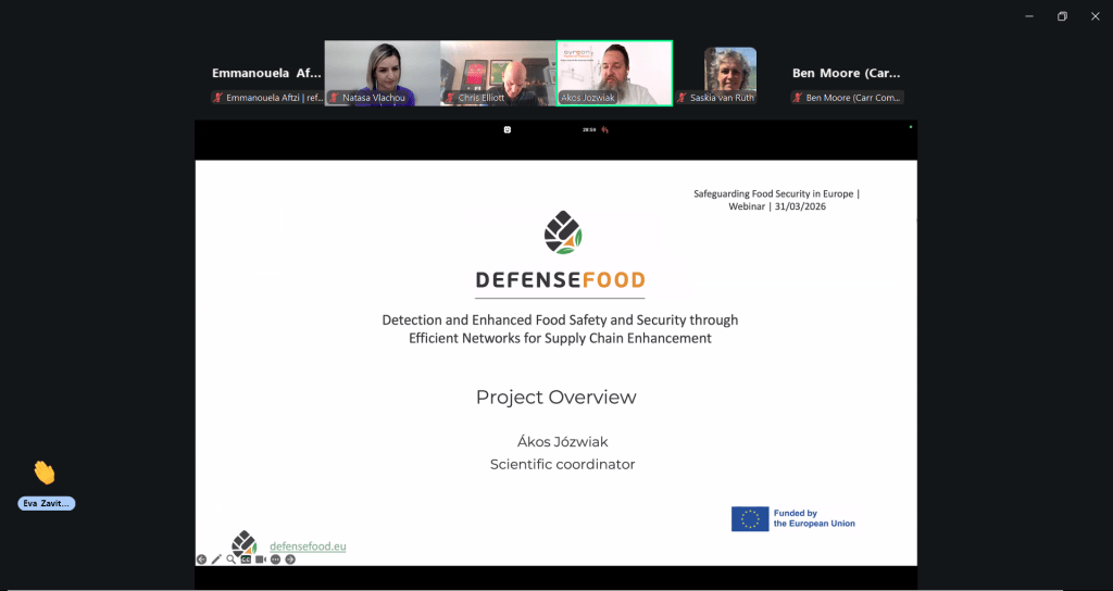 On 31 March 2026, the DEFENSEFOOD project successfully co-organised the joint webinar “Safeguarding Food Security in Europe” together with three other European projects (SECUREFOOD, ACT4FOOD, EFF-CoP). The event brought together 94 participants from across Europe for an engaging exchange on some of the most pressing challenges facing the food supply chain today.