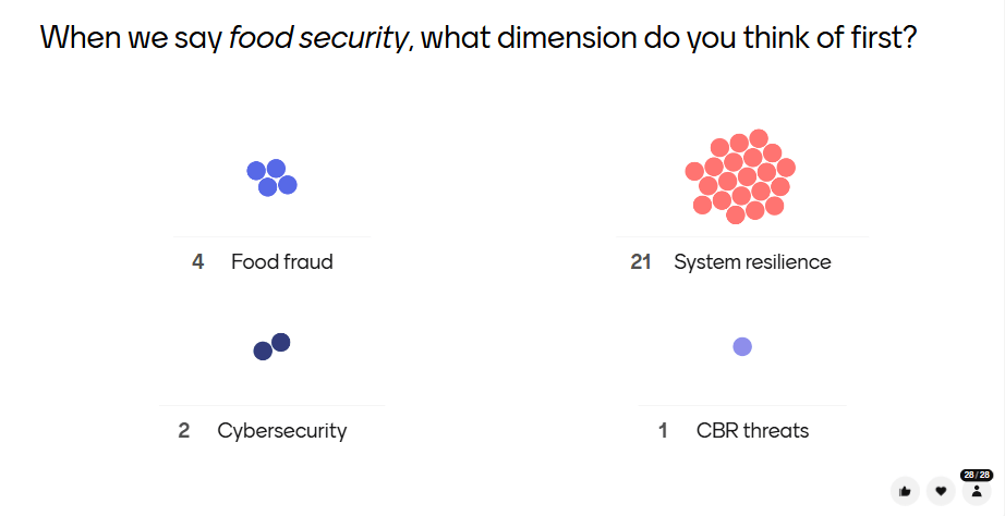 Following the discussion, the second poll (Figure 4) revealed that participants primarily associated food security with system resilience, which received 21 out of 28 responses. By contrast, fewer responses referred to food fraud (4), cybersecurity (2), and CBR threats (1). These results suggest that food security continues to be understood mainly through the lens of resilience, while emerging and intentional threats are still less strongly connected to the concept.