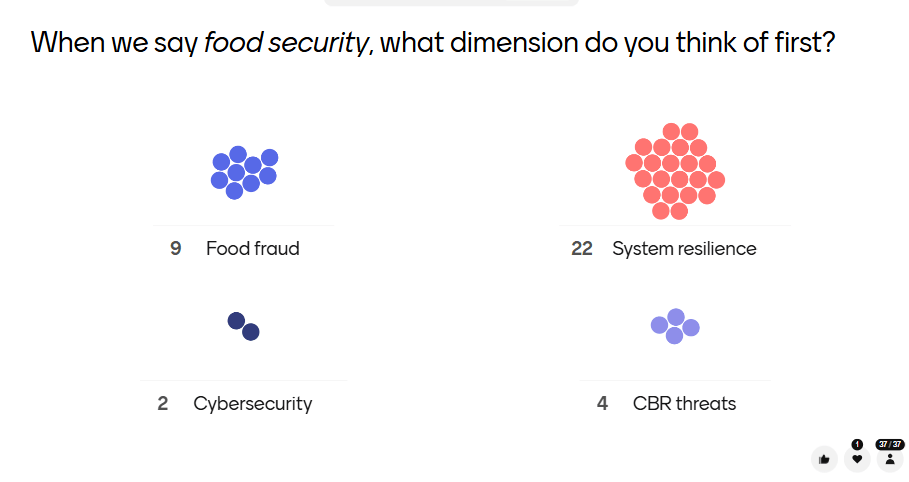 A second poll (Figure 2) explored what participants think of first when hearing the term food security. The responses showed that the concept was primarily associated with system resilience, while fewer participants linked it to food fraud, cybersecurity, or CBR threats. This suggests that food security is still widely understood through the lens of resilience and continuity, while emerging and intentional threats are less immediately connected to the concept.